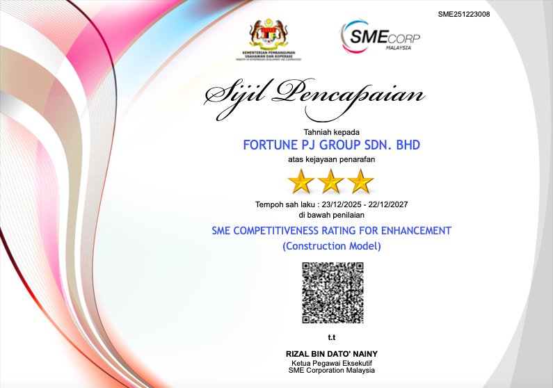FORTUNE PJ GROUP SDN BHD, founded in early 2022 with a CIDB G3 license, has rapidly advanced to a G5-certified contractor through dedication and smart strategy. Guided by a clear mission to deliver quality projects and raise industry standards, our success is built on strong leadership, skilled teams and trusted client relationships. We continue to grow as a reliable name in Malaysia’s construction and roadworks sector.